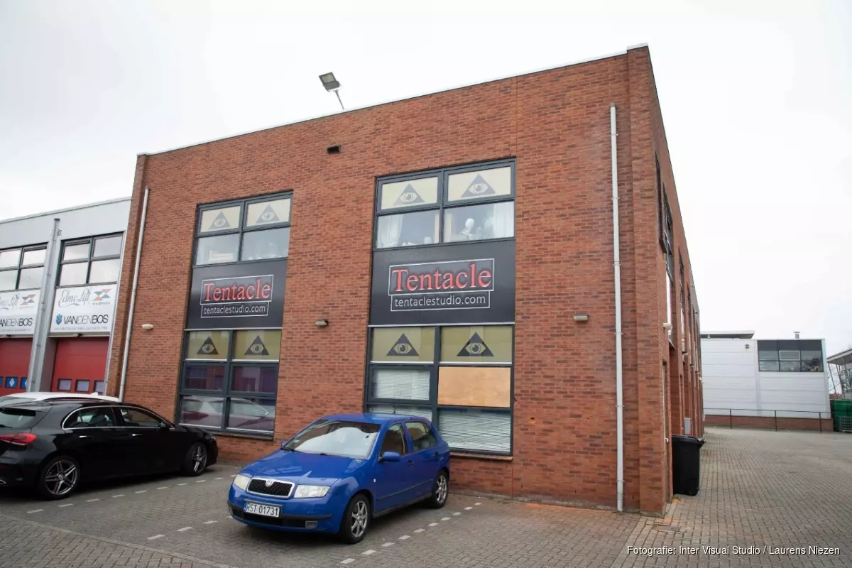In het bedrijfspand zijn meerdere gaten te zien. Het gaat om een gebouw van een bedrijf dat rekwisieten, kostuums en maskers maakt.