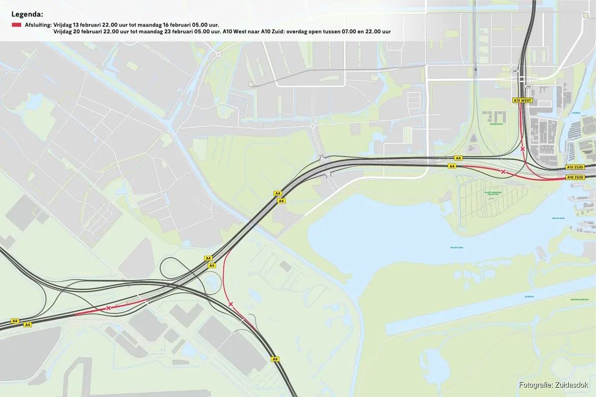 Zuidasdok voert in het eerste weekend hijswerkzaamheden uit bij de nieuwe brug over de Schinkel. In het tweede weekend voert Zuidasdok brug- en verkeerstechnische werkzaamheden uit. Voor de veiligheid van de weggebruikers en de bouwers is de A10 Zuid in de richting van Amsterdam tot oprit S108 Amsterdam - Oud Zuid afgesloten. Op deze brug komen in de toekomst twee extra rijstroken voor verkeer met bestemming Amsterdam. Het wegverkeer wordt omgeleid. De vertraging kan oplopen tot een uur.