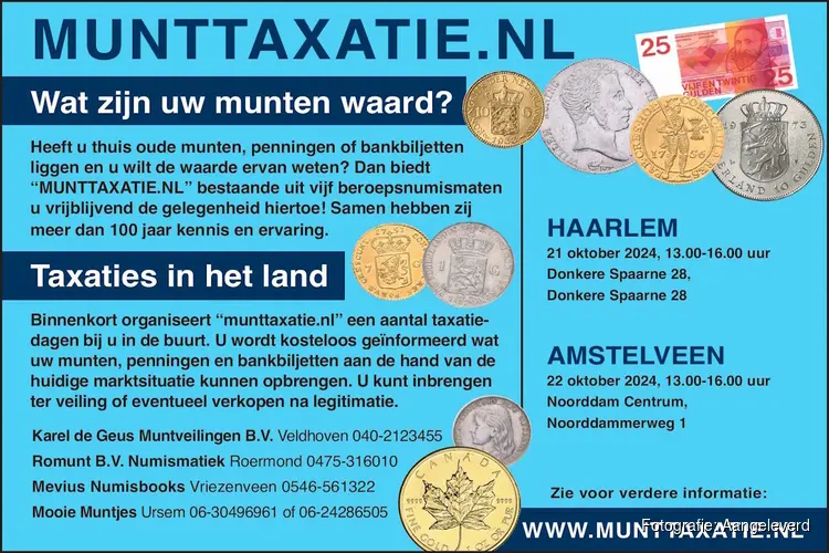 Een dag later, op DINSDAG 22 OKTOBER a.s. is Munttaxatie.nl aanwezig in Amstelveen (13.00-16.00 uur, Noorddammcentrum, Noorddammerweg 1).